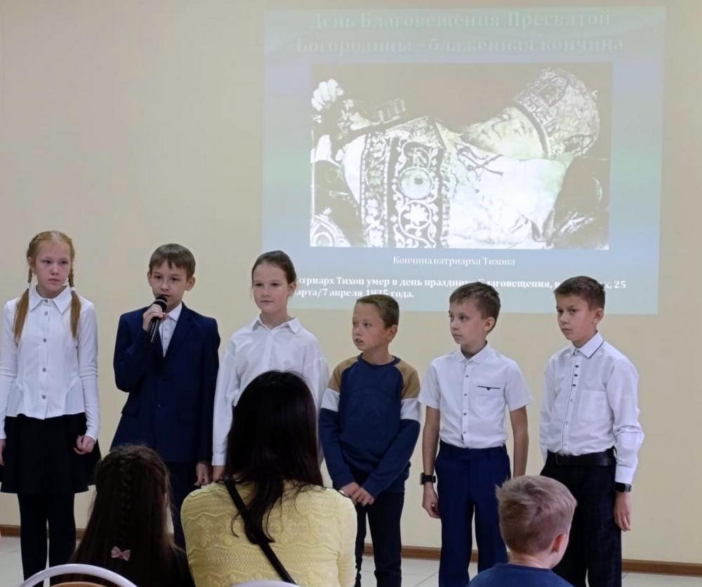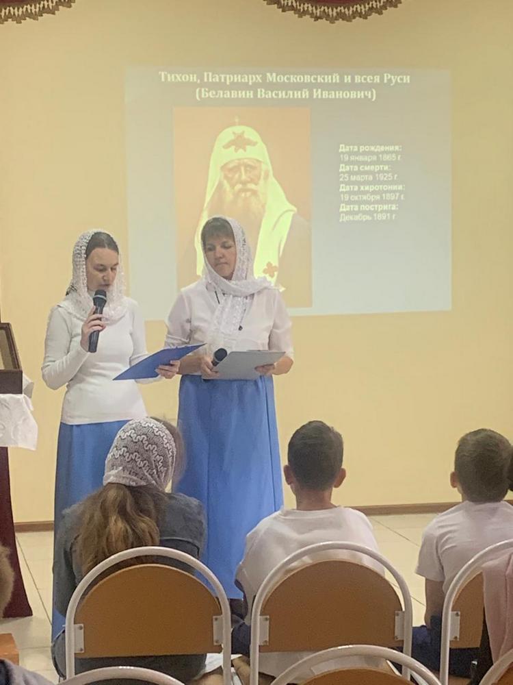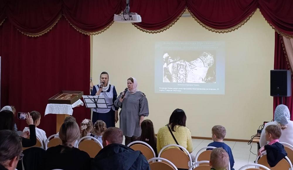 Присутствующие посмотрели видеоматериал и слайдовую презентацию о жизни святителя Тихона, прозвучали соответствующие теме мероприятия стихи и песня. Подвел итог вечера памяти благочинный Кирсановского благочиннического округа священник Алексей Проворов. В актовом зале духовного центра была размещена экспозиция «Кто ны разлучит от любви Божия», подготовленная при поддержке «Научно-просветительского фонда имени святого Патриарха Тихона». Она представляет собой 15 модулей – глав, каждая из которых повествует об одном из периодов служения святителя Тихона. Все желающие имели возможность познакомиться с её содержанием.