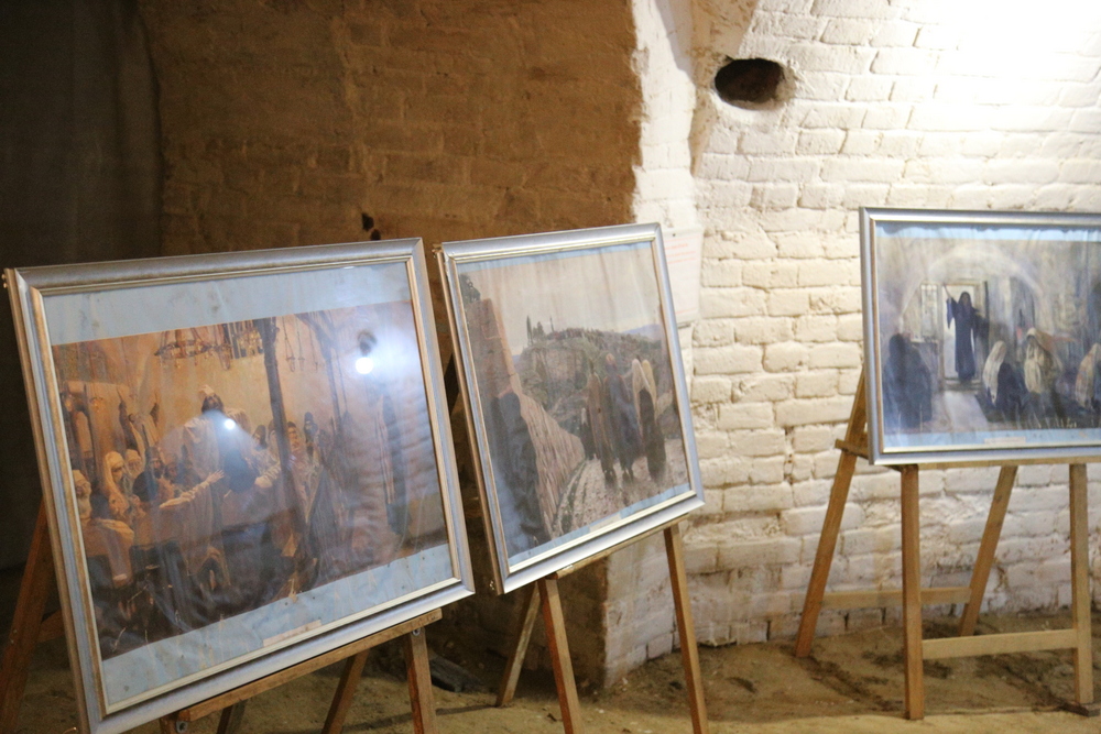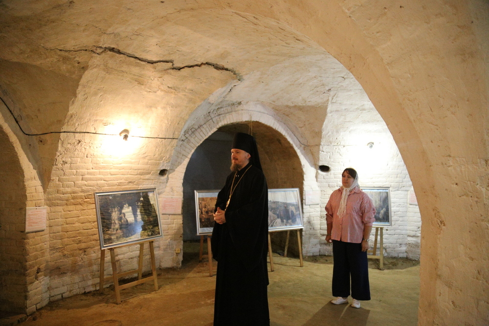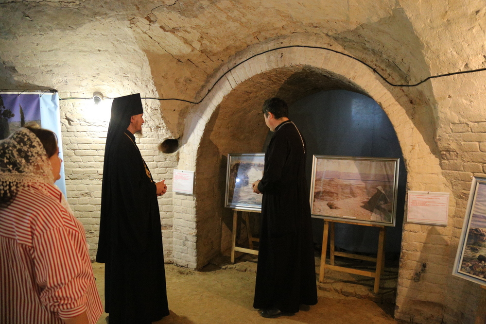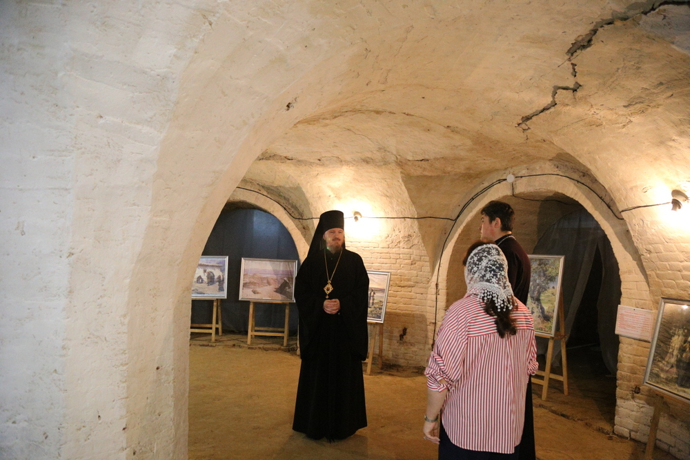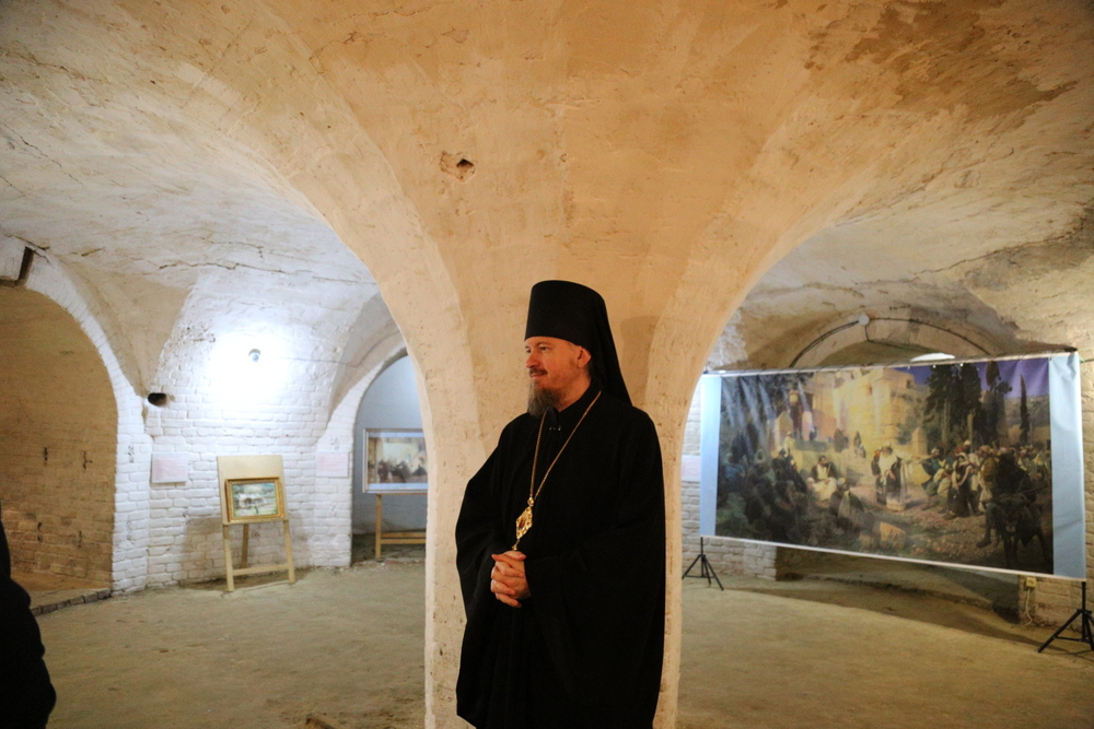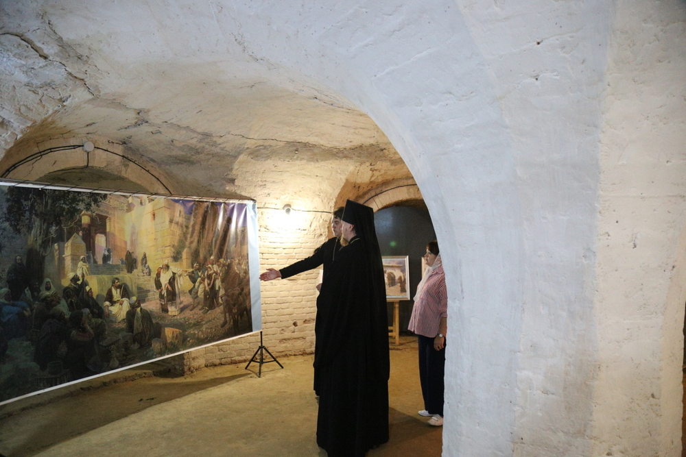 В подвальном помещении храма правящий архиерей ознакомился с выставкой картин об истории земной жизни Иисуса Христа в трактовке Василия Поленова «Евангельский мир глазами Василия Поленова».