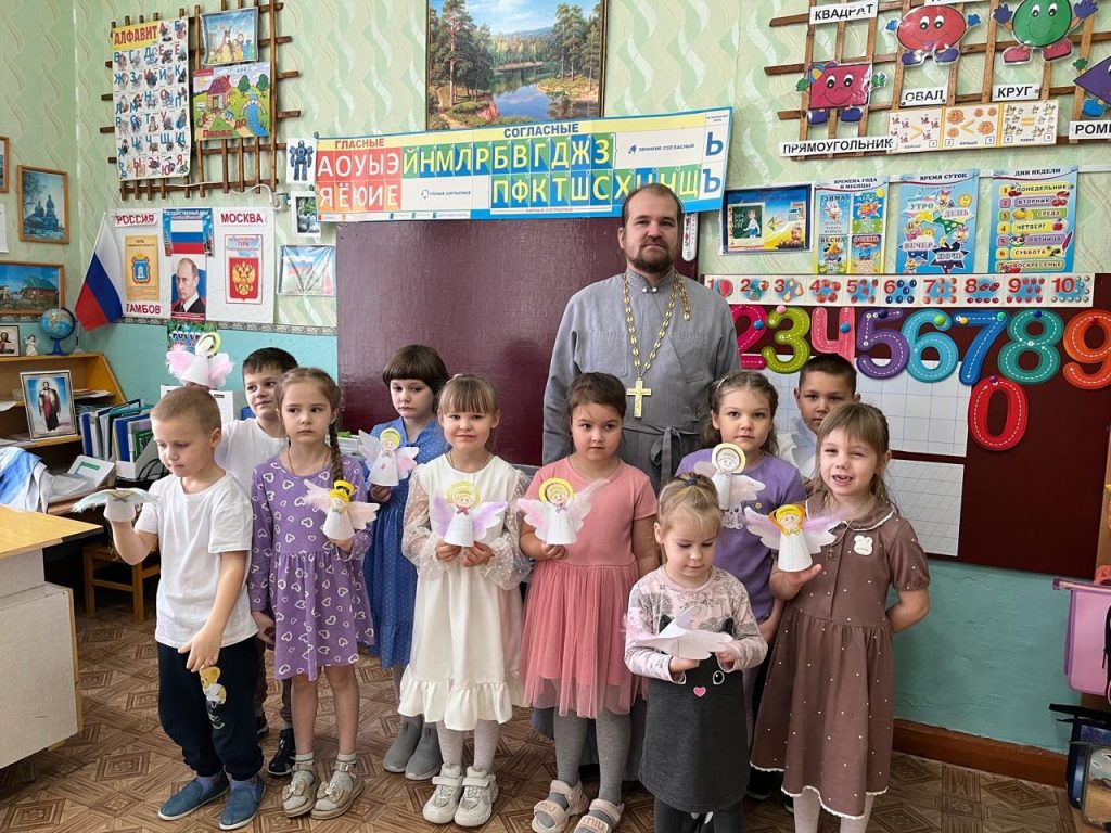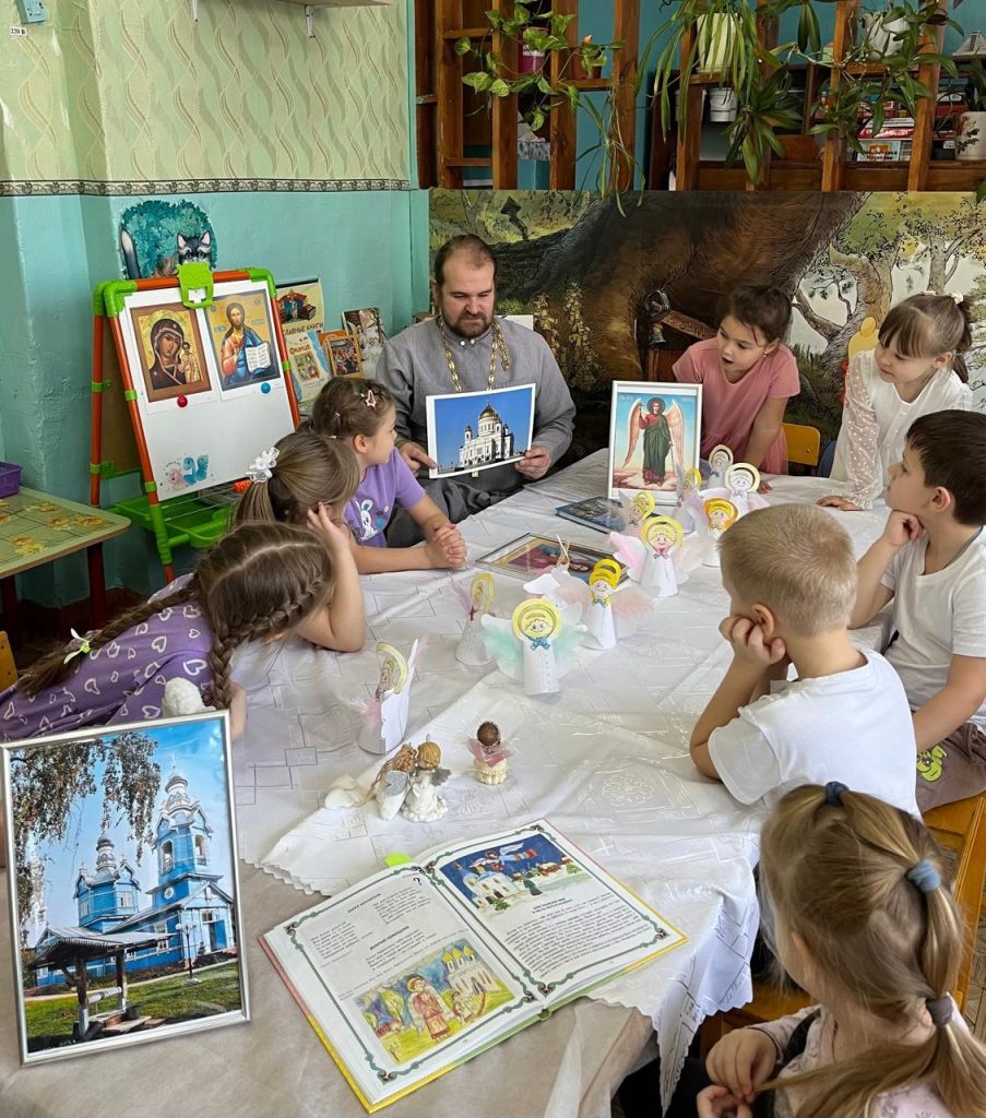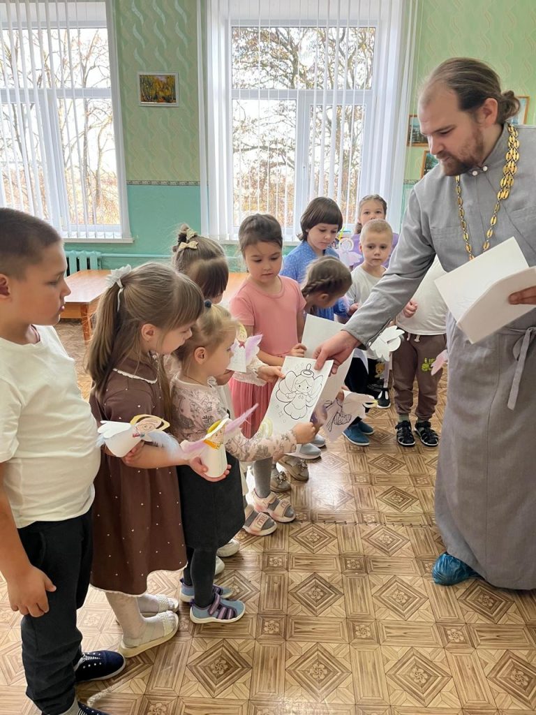 Накануне праздника Собора Архистратига Михаила и прочих Небесных Сил бесплотных батюшка рассказал детям о наших небесных защитниках — Ангелах, о том как важно совершать хорошие поступки, помогать ближним. И как важно вовремя попросить прощения, если когда-то обидел. Беседа прошла в тёплой и доверительной атмосфере. В знак добрых пожеланий дети получили в подарок раскраски и фигурку ангелочка.