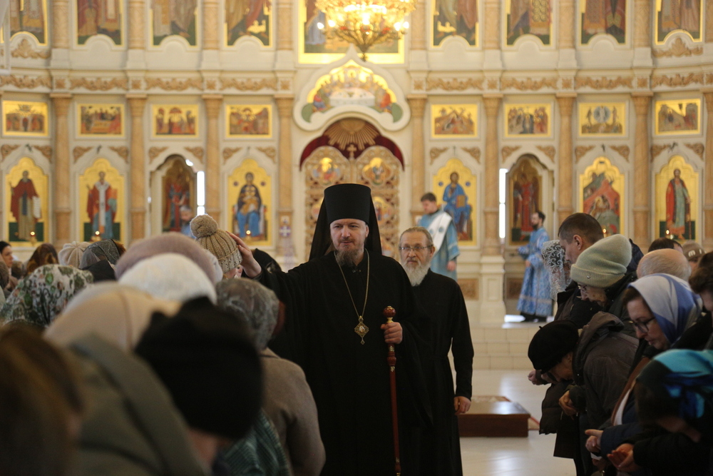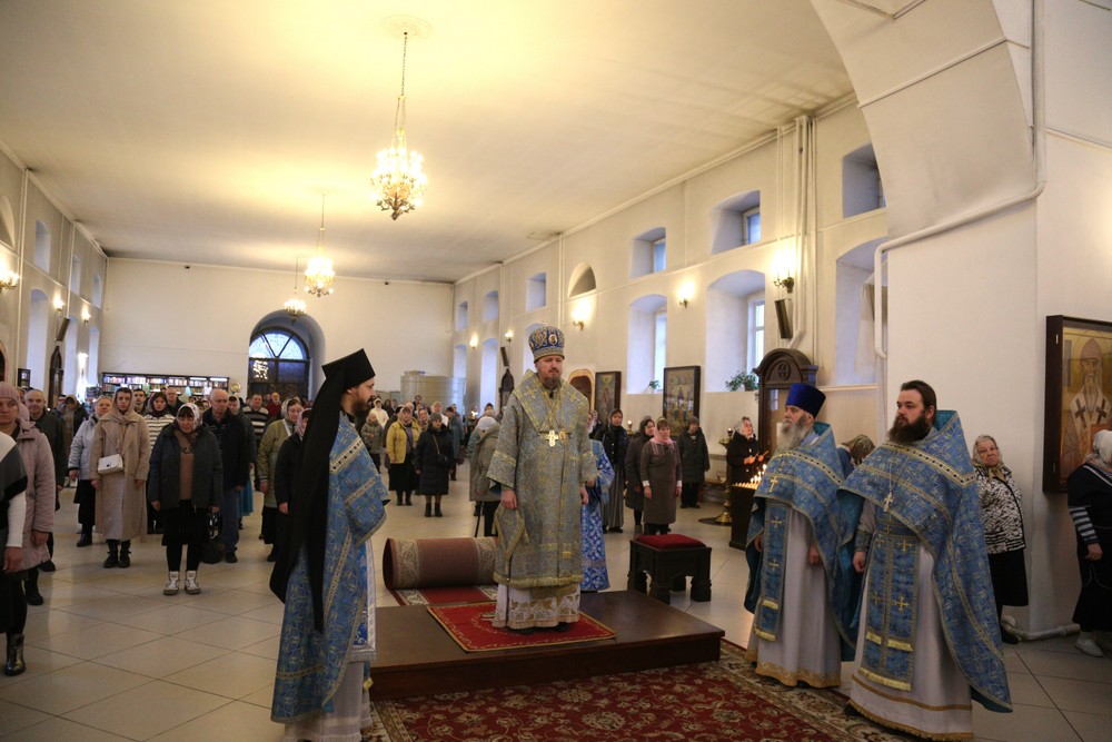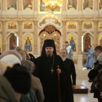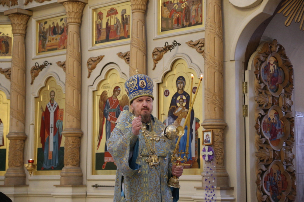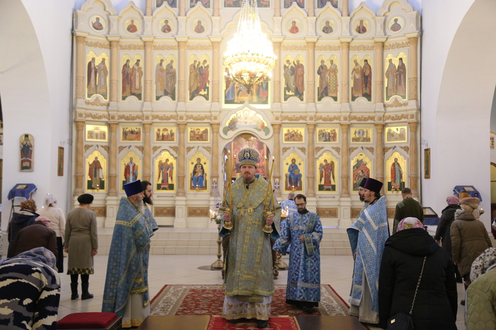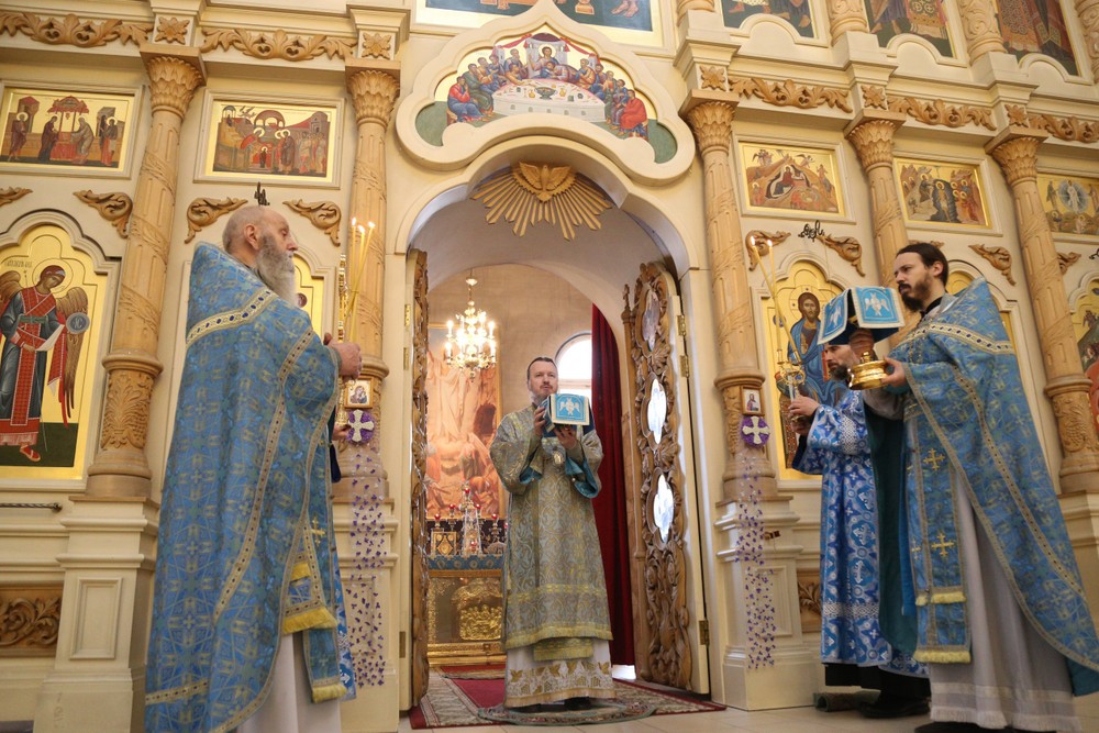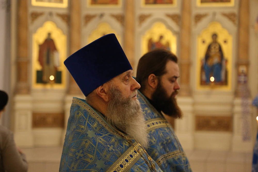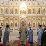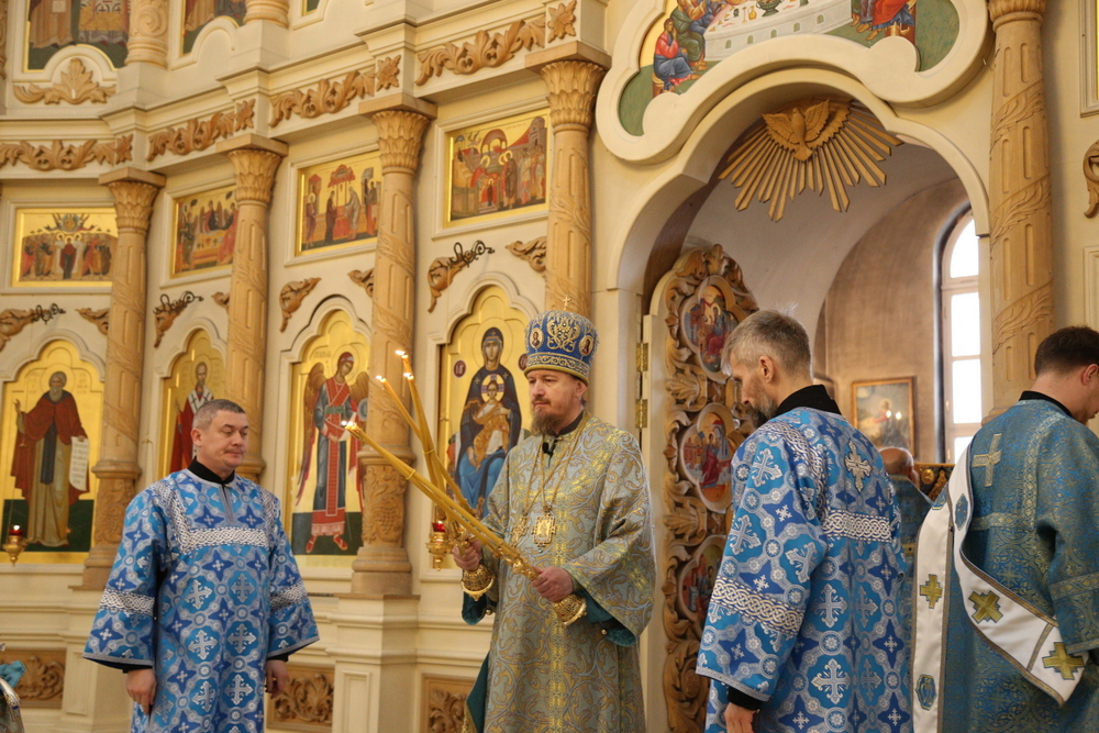 Его Преосвященству сослужили клирики собора: иеромонах Питирим (Сухов), священник Виктор Кончаков, священник Владимир Васильев, священник Сергий Растрёпин, диакон Сергий Демидов и диакон Алексий Сайганов.