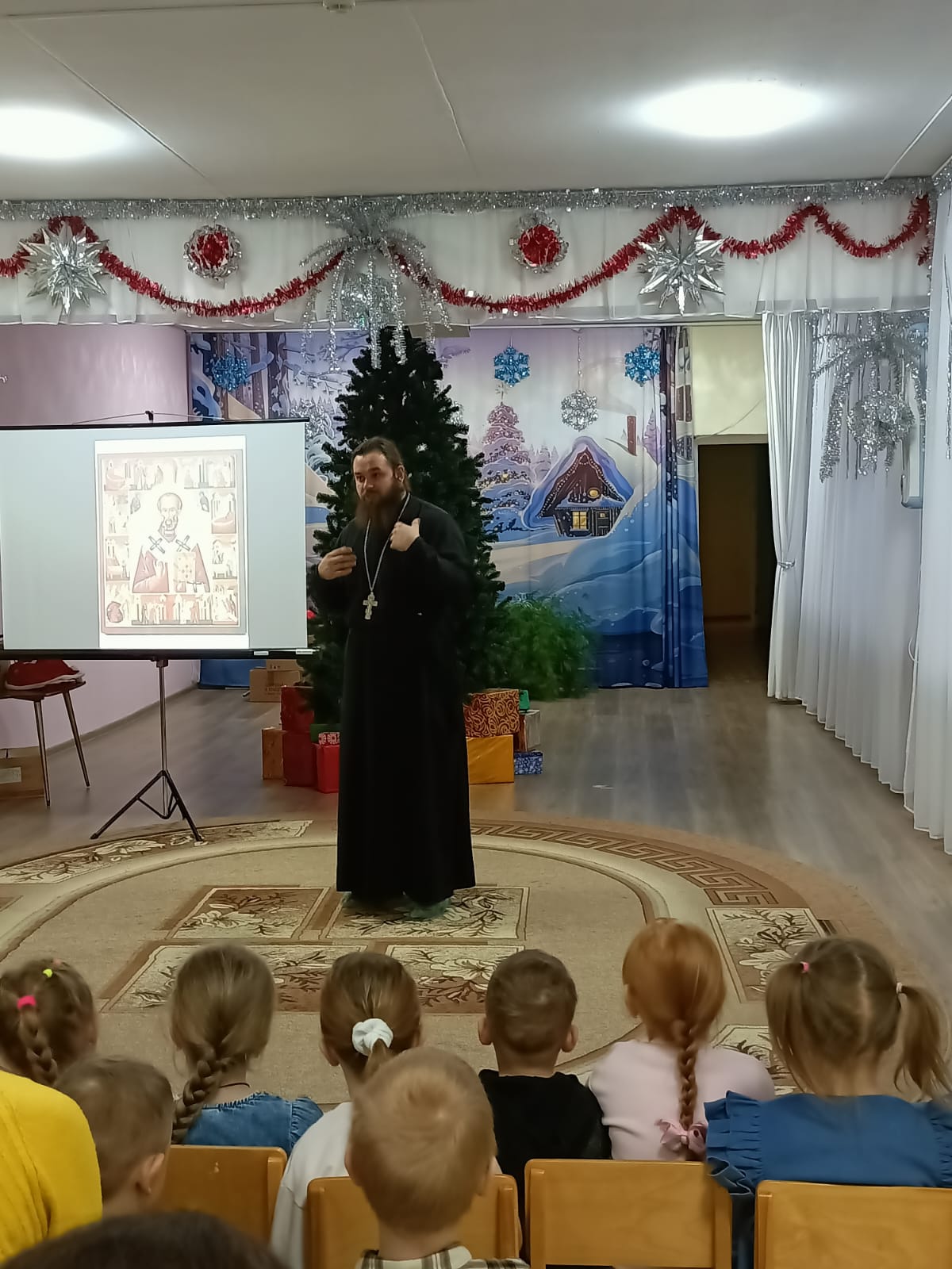 Отец Сергий рассказал детям о святителе Николае Чудотворце, поведав одну из историй: «С самого детства святитель Николай стремился к благочестивому, молитвенному образу жизни. Еще в юности святой творил дела милосердия. Например, узнав, что его сосед обнищал и не может выдать замуж своих дочерей, Николай стал тайно оставлять под окном их дома узелки с деньгами, тем самым обеспечив семью и избавив дочерей от бесчестия».