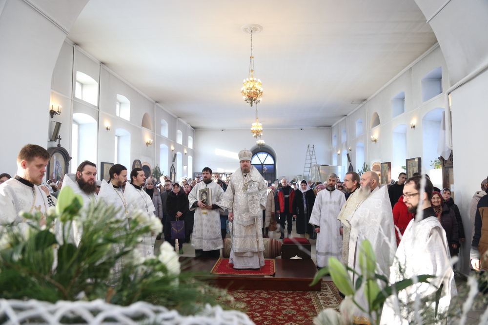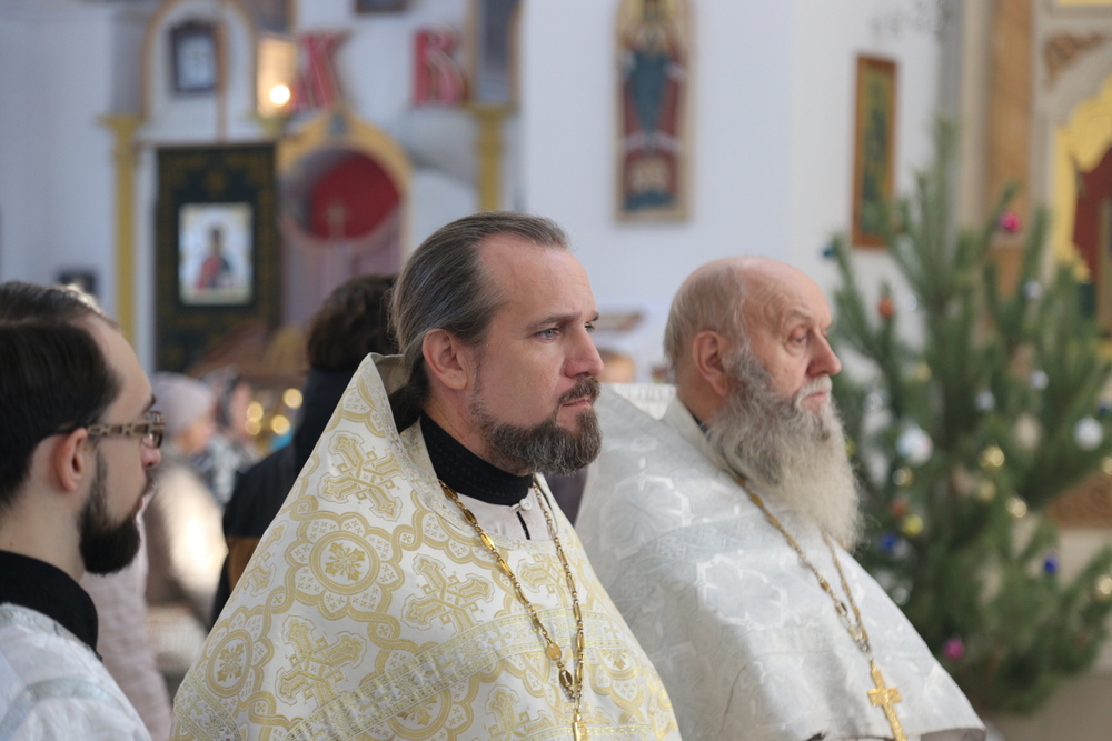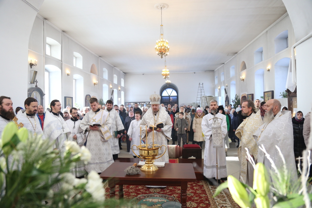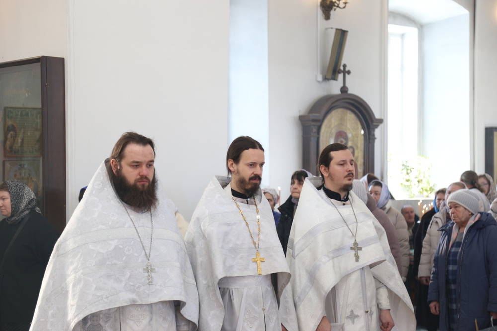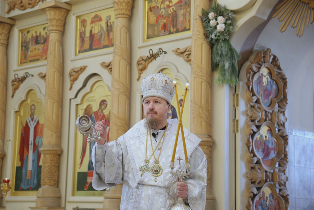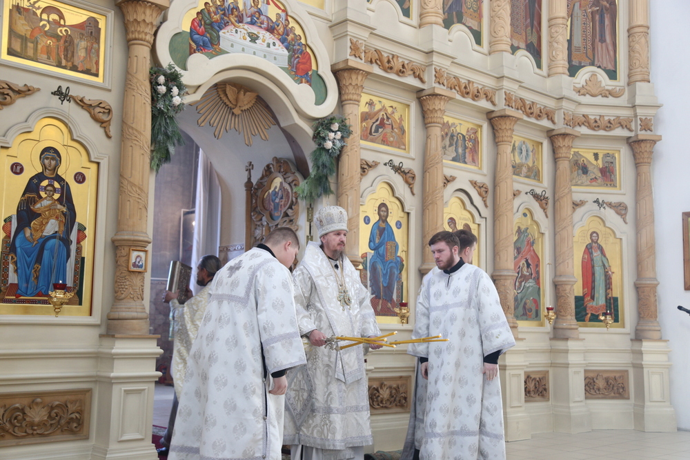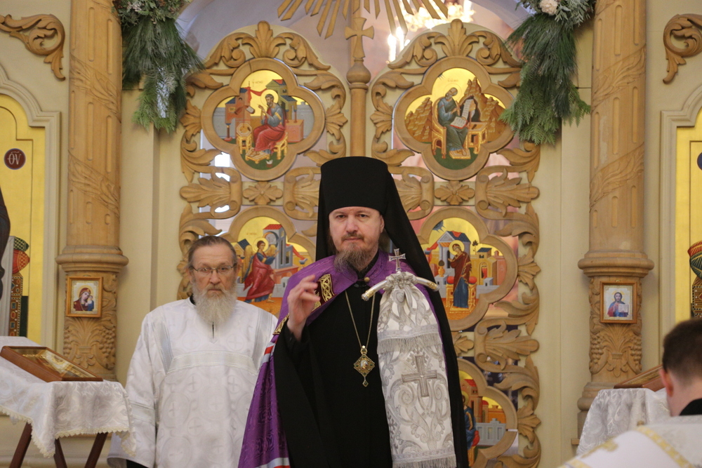 Его Преосвященству сослужили клирики собора: иеромонах Питирим (Сухов), священник Виктор Кончаков, священник Владимир Алейников, священник Владимир Васильев, священник Сергий Растрепин, дьякон Сергий Демидов и диакон Алексий Сайганов.
