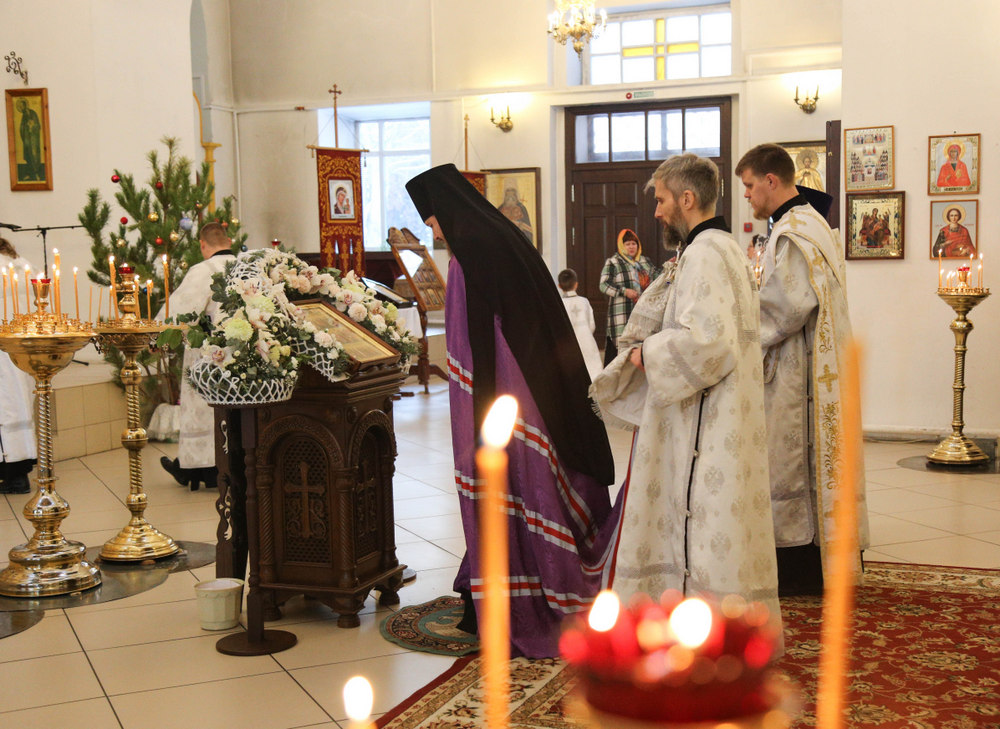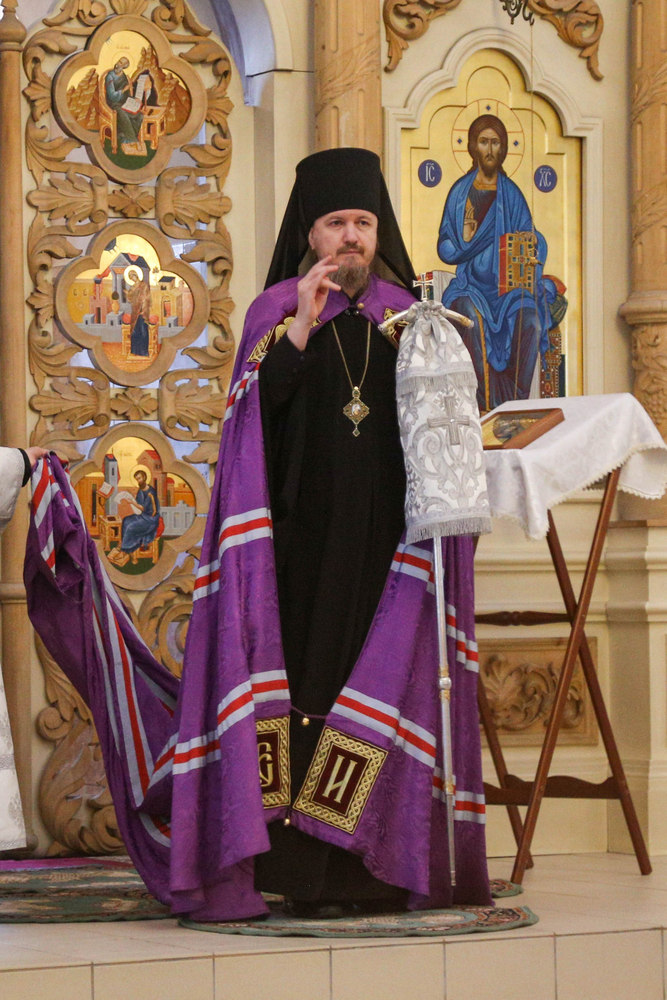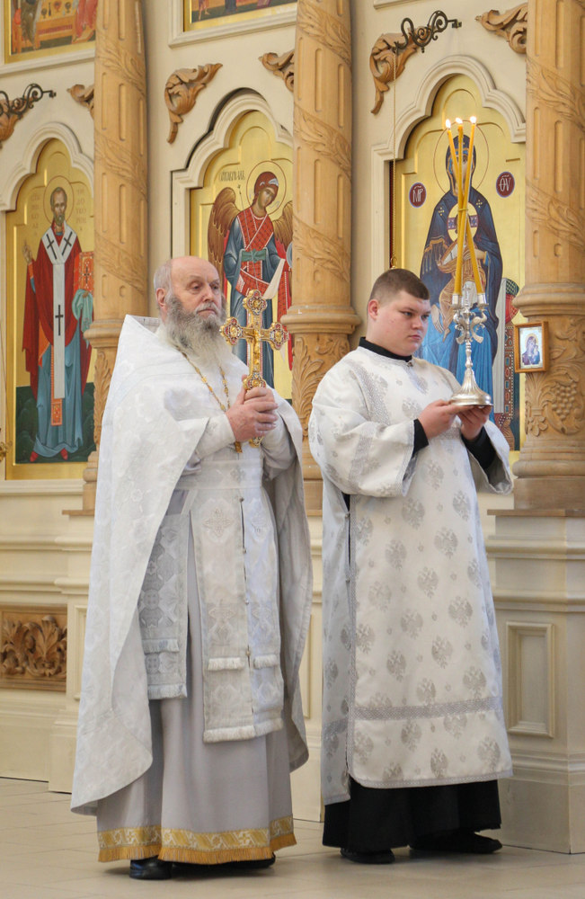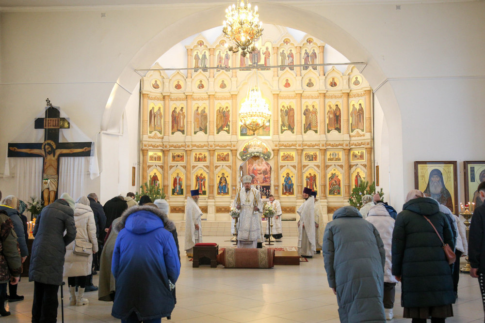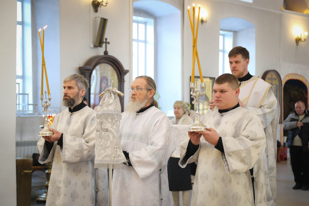 Его Преосвященству сослужили клирики собора: священник Виктор Кончаков, священник Владимир Васильев, священник Алексий Тишкин и диакон Сергий Демидов.