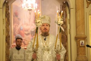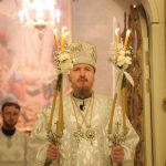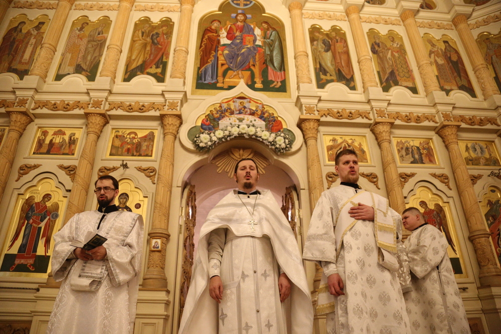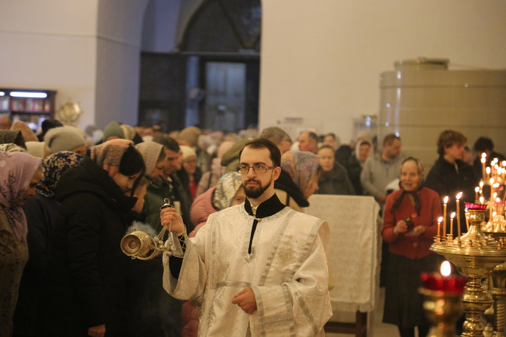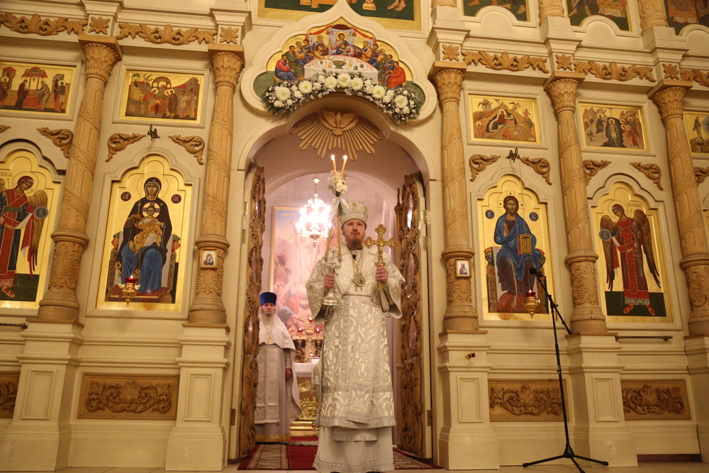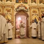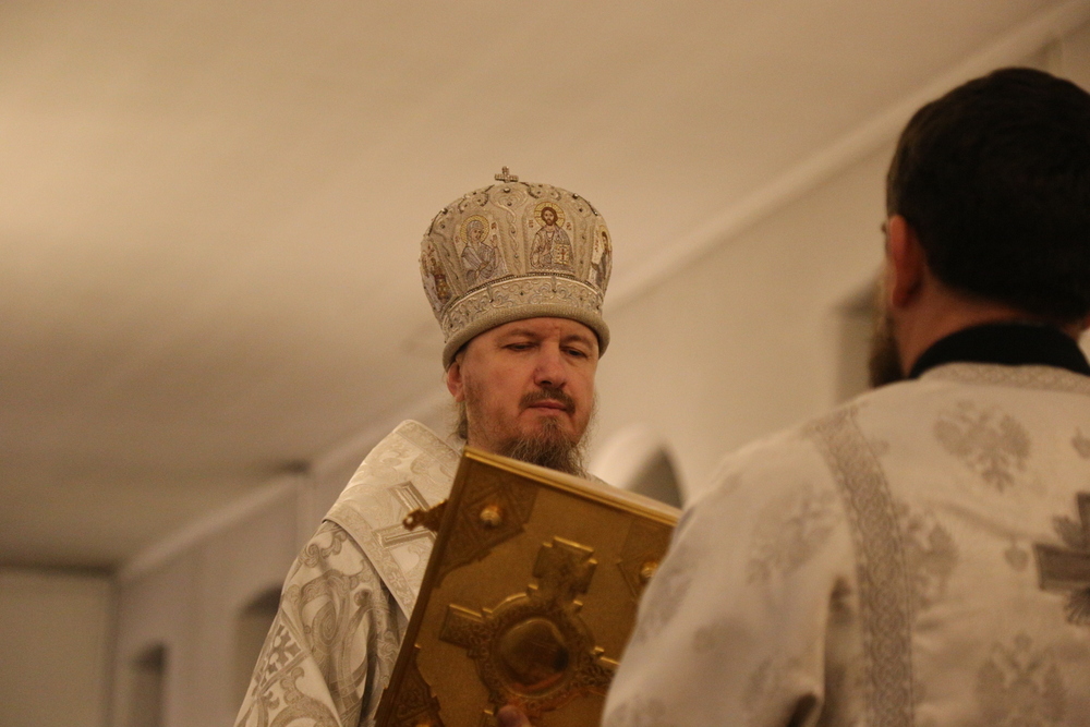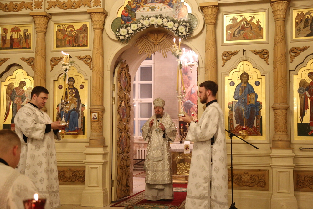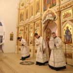Его Преосвященству сослужили клирики собора: священник Виктор Кончаков, священник Владимир Васильев, священник Сергий Растрепин, диакон Сергий Демидов и диакон Алексий Сайганов.