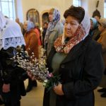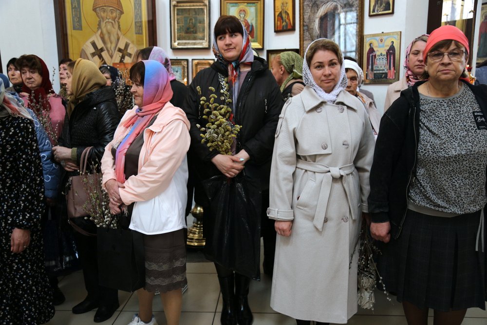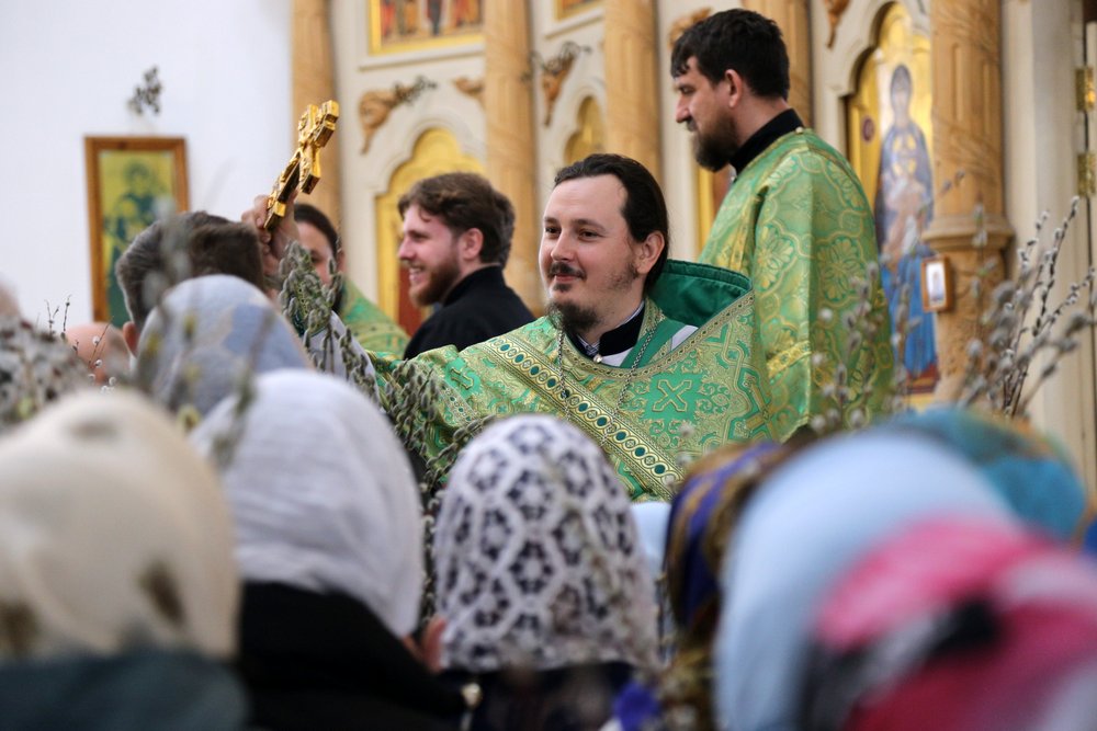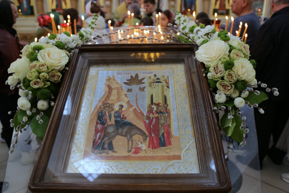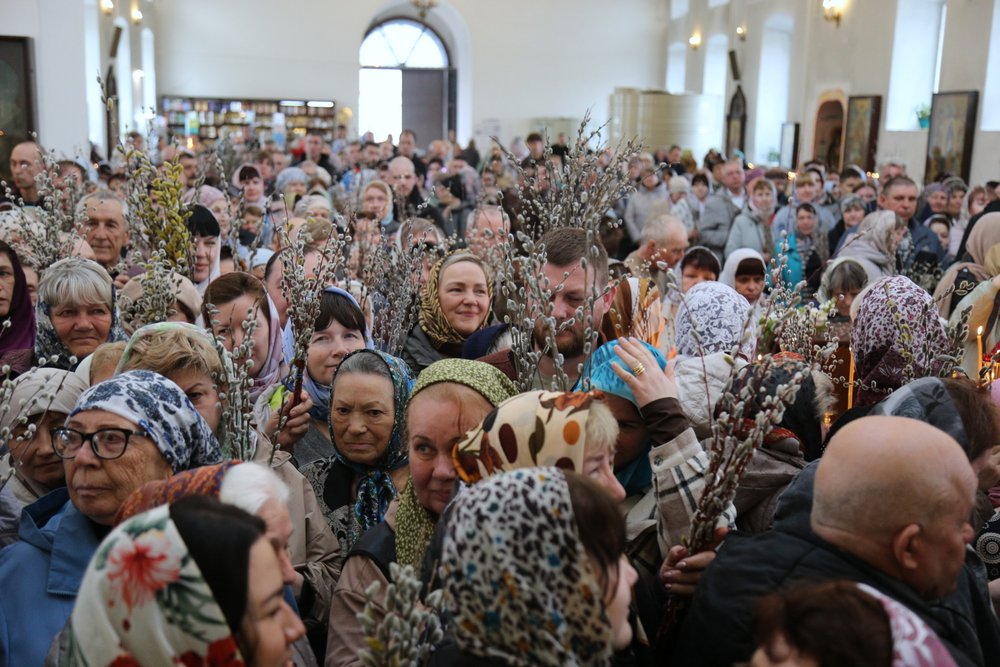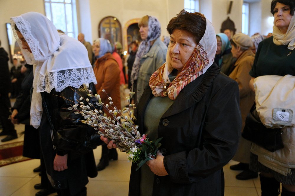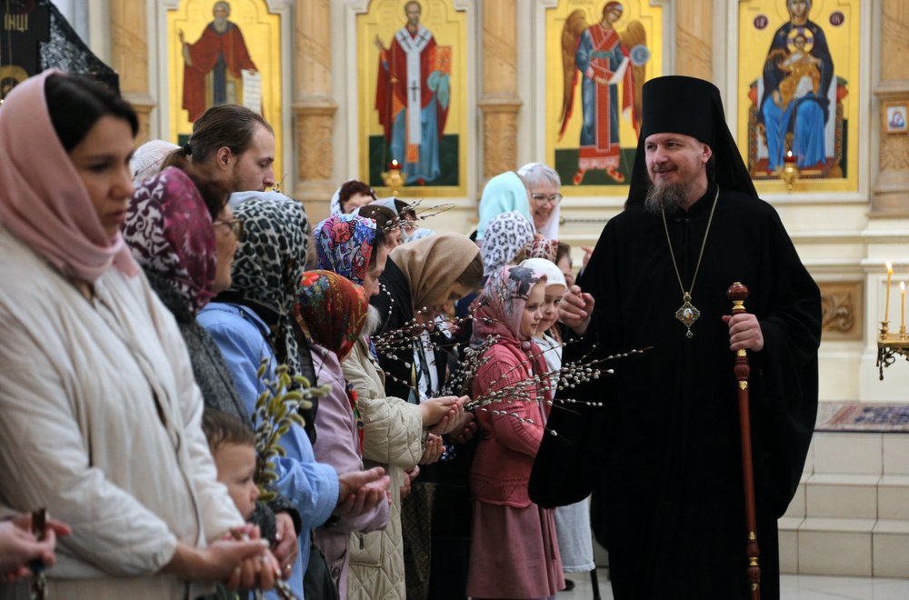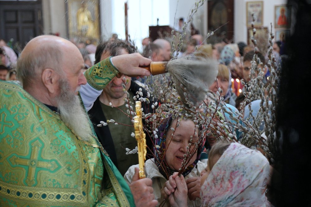 По православной традиции в этот праздник прихожане кафедрального собора пришли на богослужение с ветвями вербы, которые были окроплены святой водой.