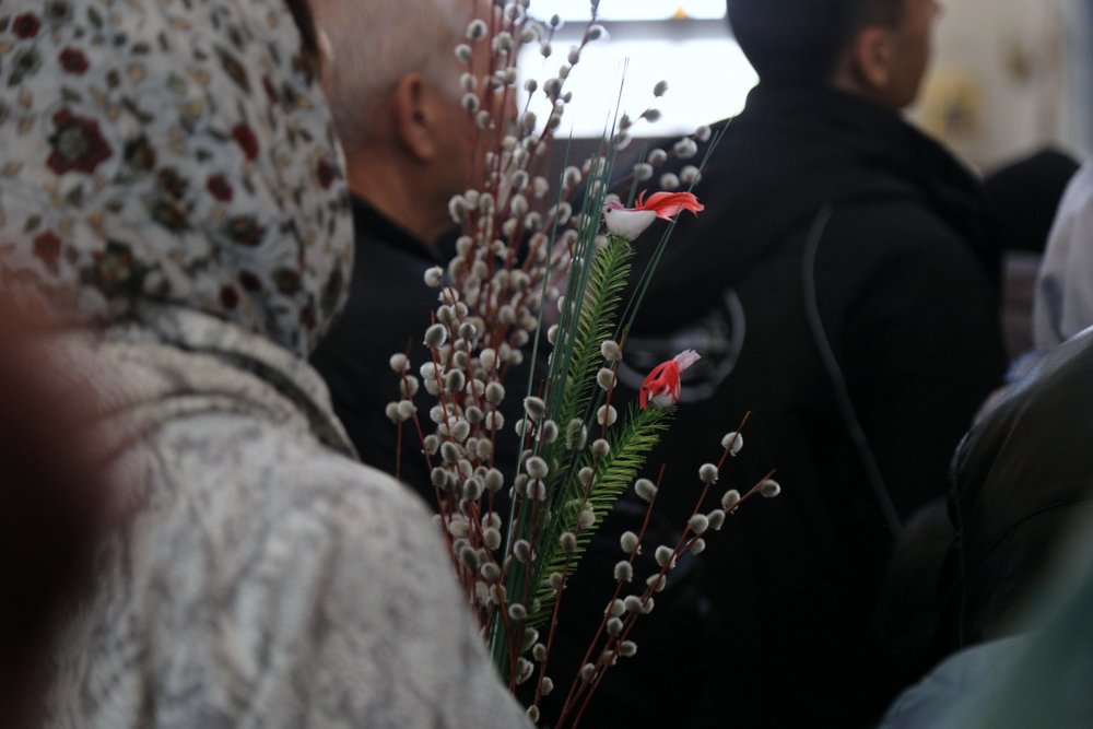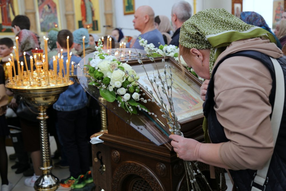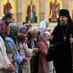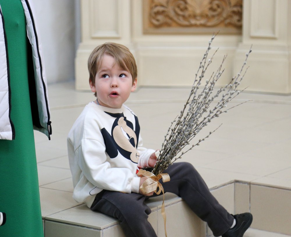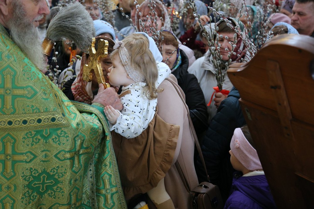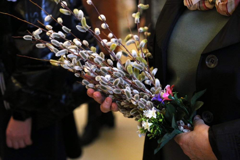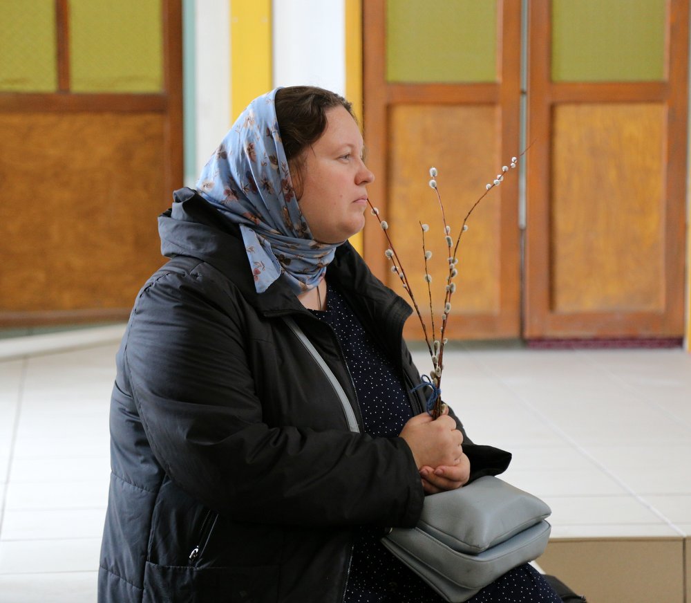 По православной традиции в этот праздник прихожане кафедрального собора пришли на богослужение с ветвями вербы, которые были окроплены святой водой.
